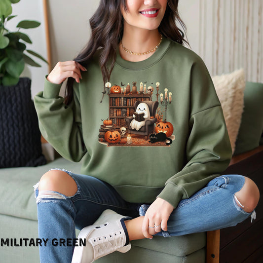 Cozy Halloween Ghost Sweatshirt Retro Ghost Reading Shirt Sweatshirt Cute Spooky Ghost Shirt Halloween Teacher Sweatshirt Halloween Shirt