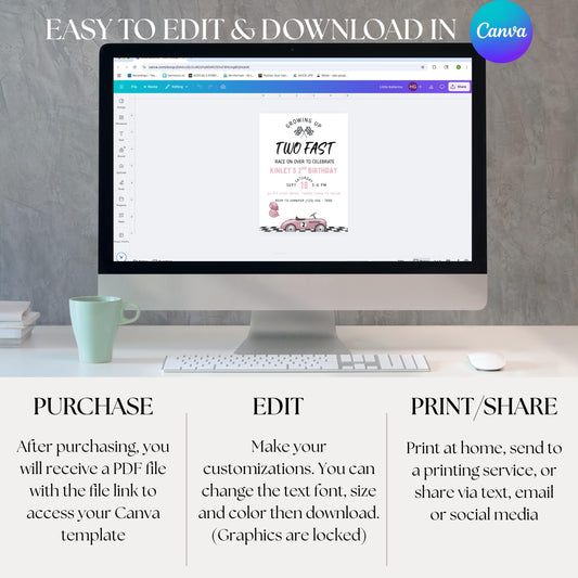 Two Fast Birthday Invitation 2nd Birthday Invite Pink Girls Birthday Invite Growing Up Two Fast Invite Vintage Car Invitation Canva Template