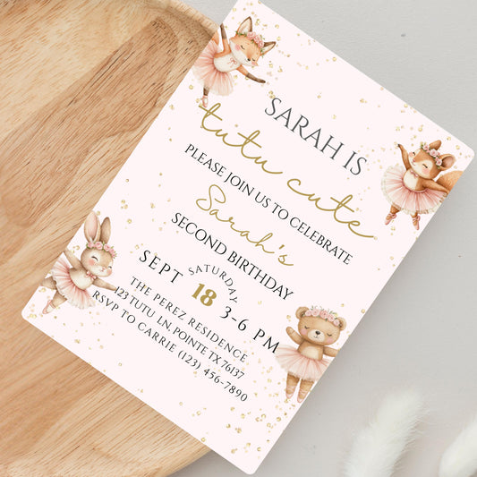 Tutu Cute Birthday Invitation Ballerina 2nd Birthday Invite Two Cute Invite Second Birthday Invitation Girl Ballet Woodland Birthday Invite