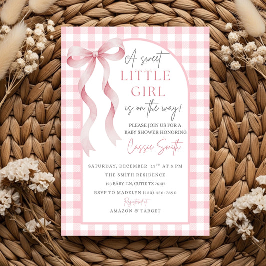 Sweet Little Girl Baby Shower Invitation Girl Baby Shower Invite Pink Gingham Baby Shower Invitation Baby On The Way Baby Shower Invite