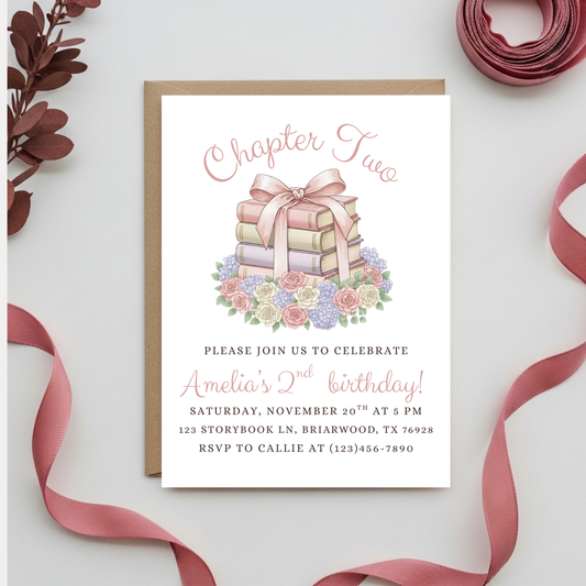 Chapter Two Storybook 2nd Birthday Party Invitation Chapter Birthday Invite Pink Bow Story Book Girls 2nd Birthday Party Editable Invite