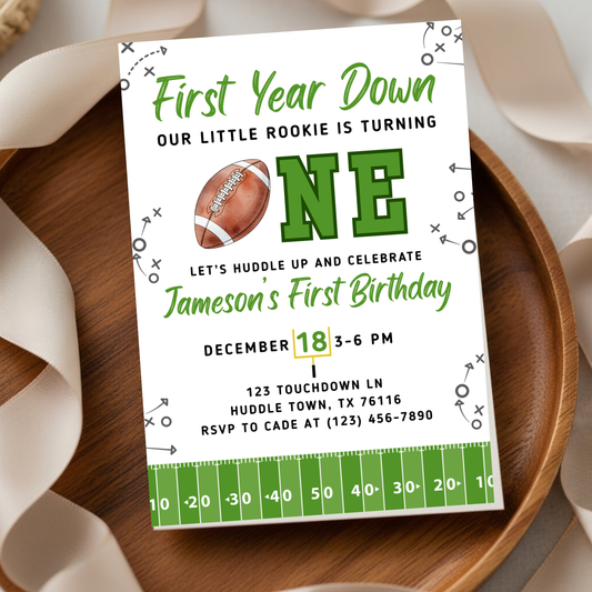 First Year Down Birthday, Football First Birthday Party, Rookie Year Football Birthday Decor, First Down Birthday Invite, Football Invite