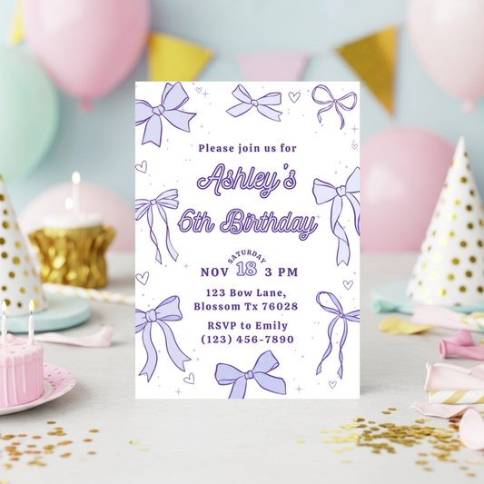Purple Bow Birthday Invite Bow Birthday Cute Bow Invite Coquette Bow Birthday Girl Birthday Invite Coquette Birthday Invitation Template