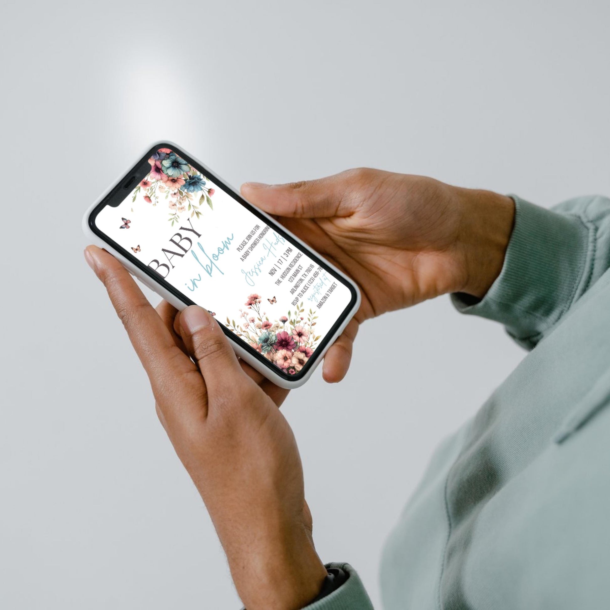 Baby in Bloom Baby Shower Invitation Floral Baby Shower Invite Blue Baby Shower Invite Canva Template Printable Invitation Gender Neutral