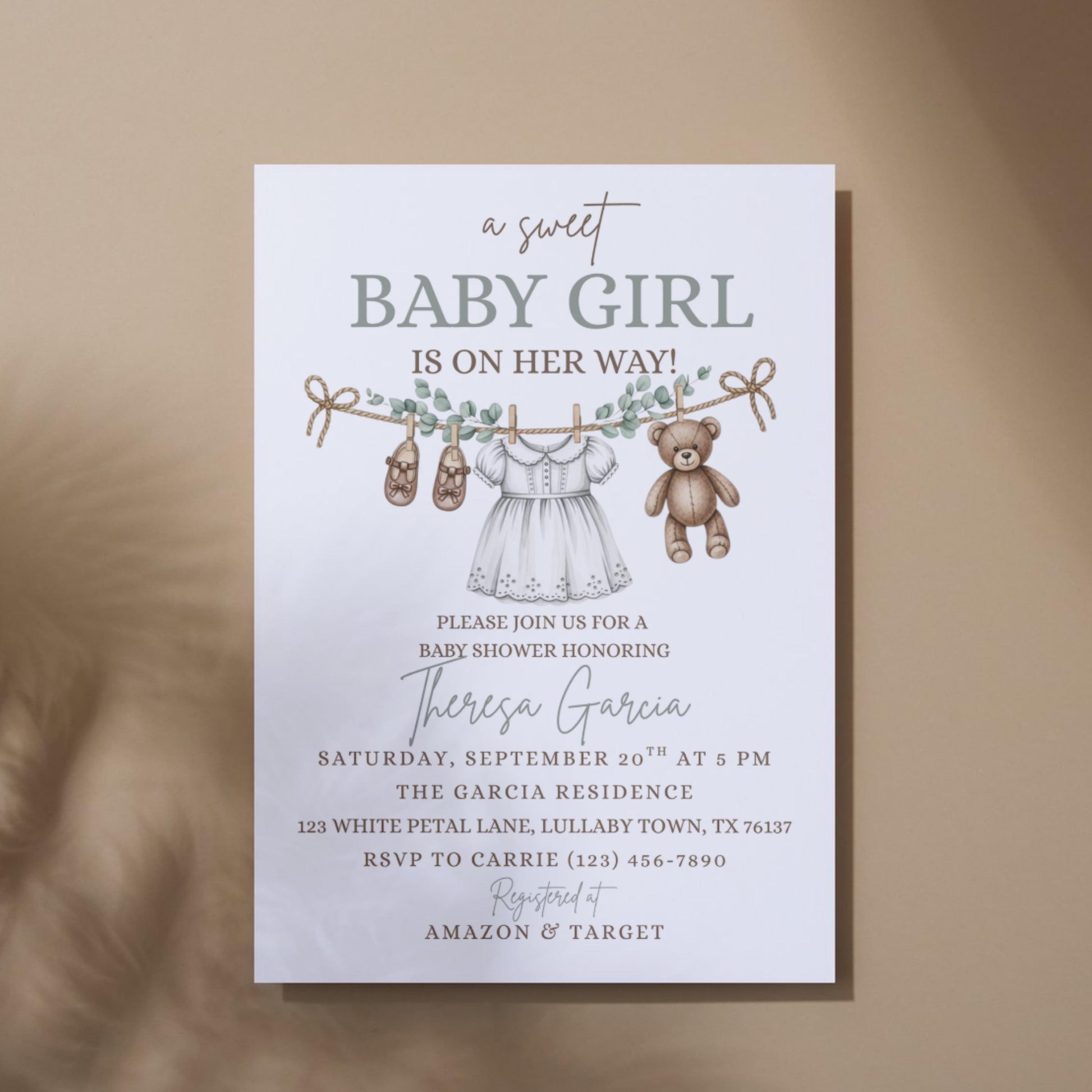 Celebrate the upcoming arrival of your little princess with our charming “A Sweet Baby Girl Is On Her Way” baby shower invitation! Perfect for welcoming family and friends to your baby shower, this adorable invitation features a soft, feminine design with sweet pastel accents that capture the joy of your baby girl’s upcoming debut.