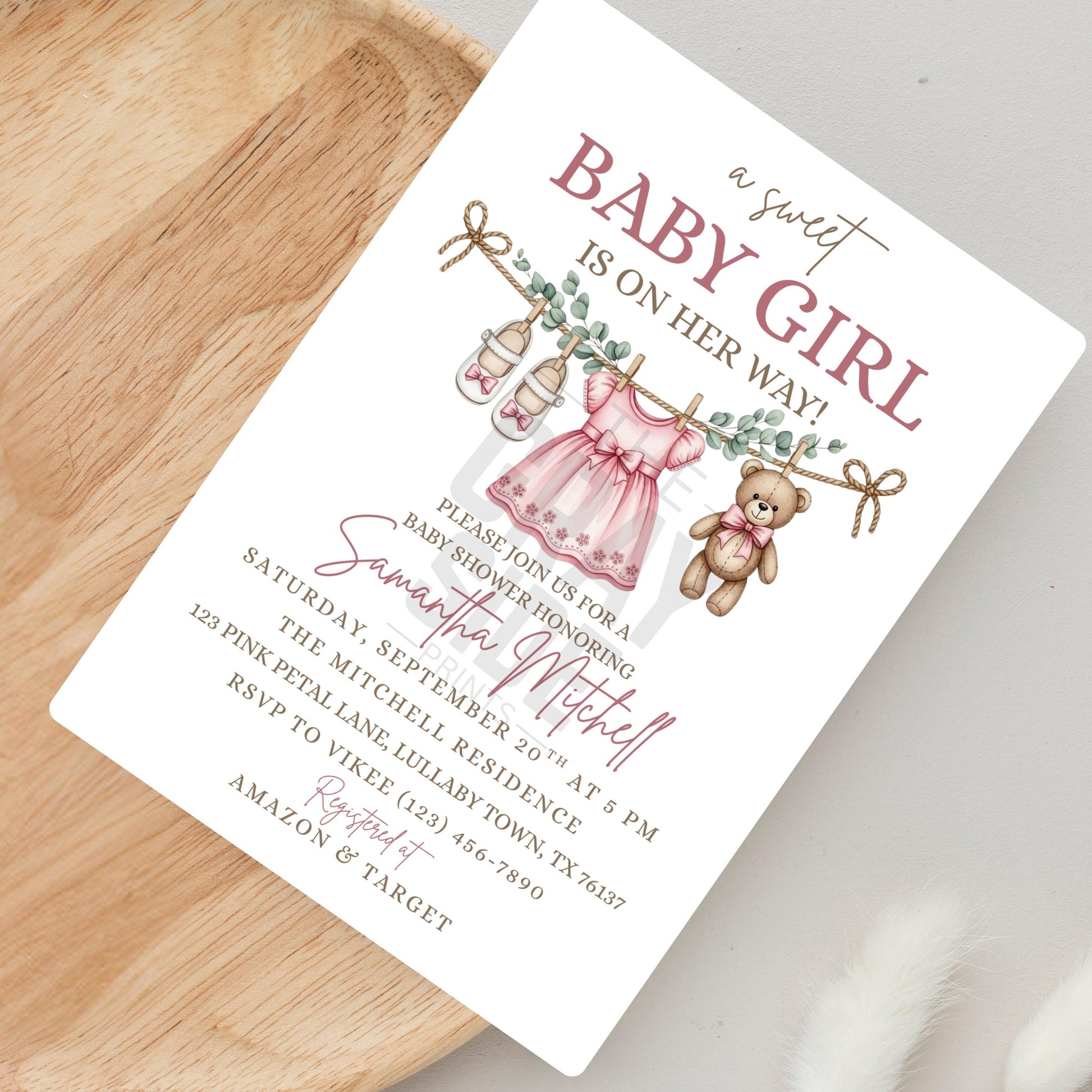 Celebrate the upcoming arrival of your little princess with our charming “A Sweet Baby Girl Is On Her Way” baby shower invitation! Perfect for welcoming family and friends to your baby shower, this adorable invitation features a soft, feminine design with sweet pastel accents that capture the joy of your baby girl’s upcoming debut.
