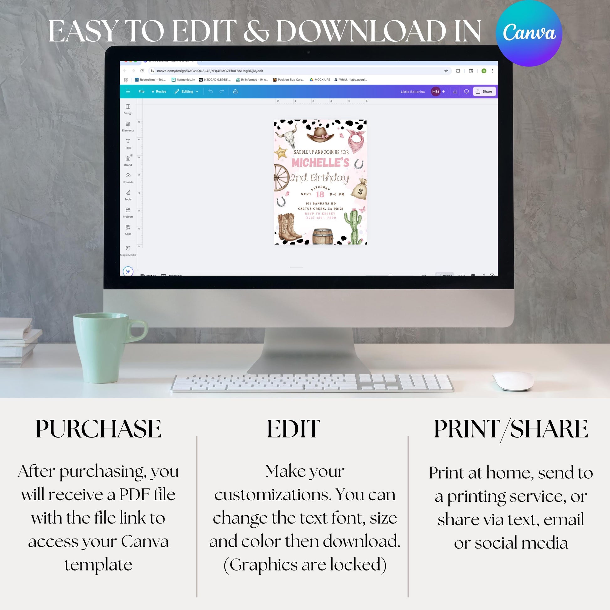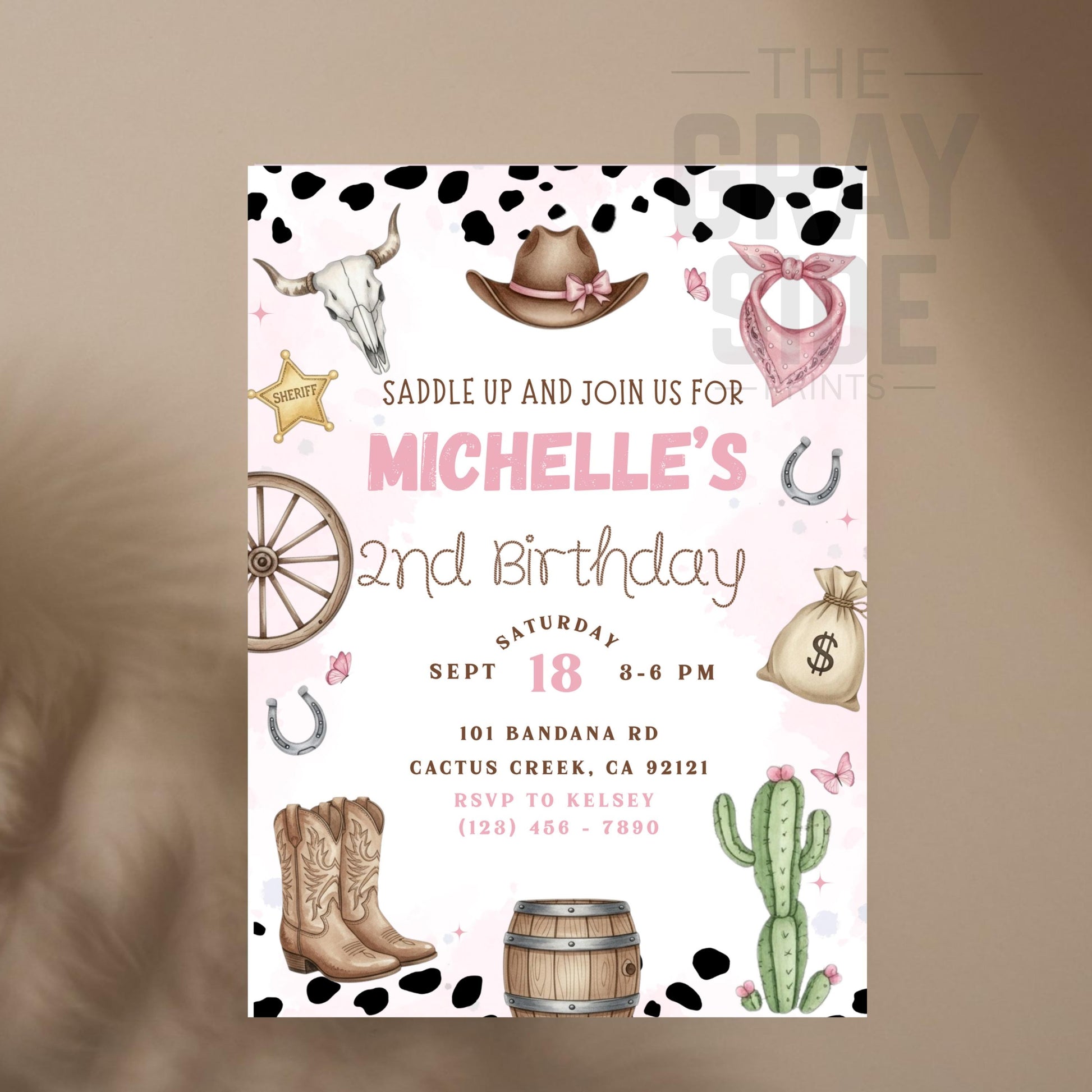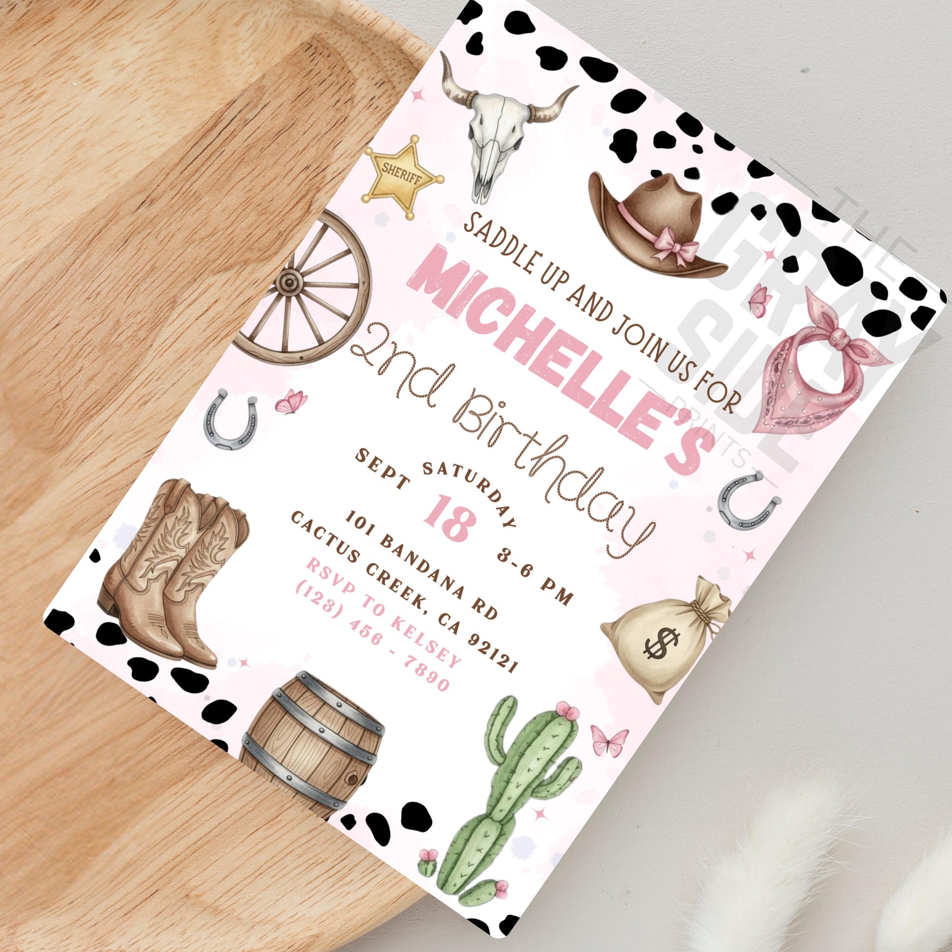 Saddle up and celebrate with this adorable pink cowgirl birthday invitation! Featuring cow print, boots, hats, cacti, and western accents, this editable Canva template is perfect for a rodeo, farm, or country-themed party. Personalize with your child’s name, age, and party details in minutes—no software required.