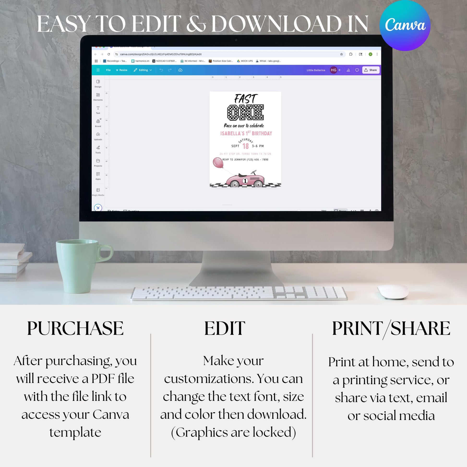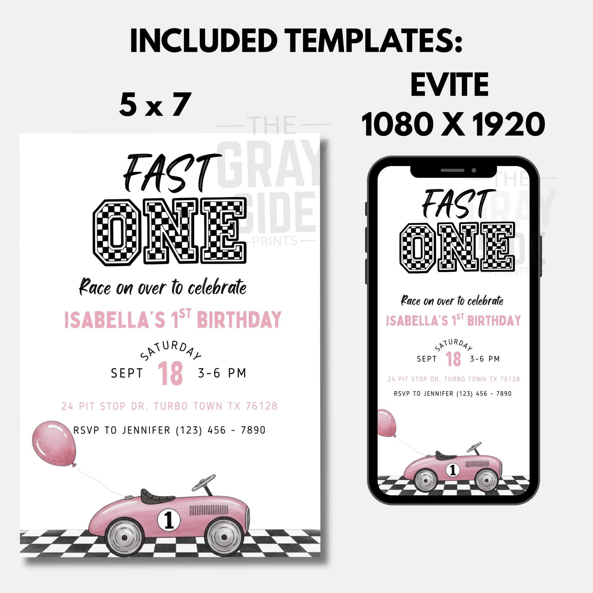 Fast One Birthday Invitation Race Car Birthday Invite Girl 1st Birthday Pink Birthday Invitation Editable Template Girls First Birthday