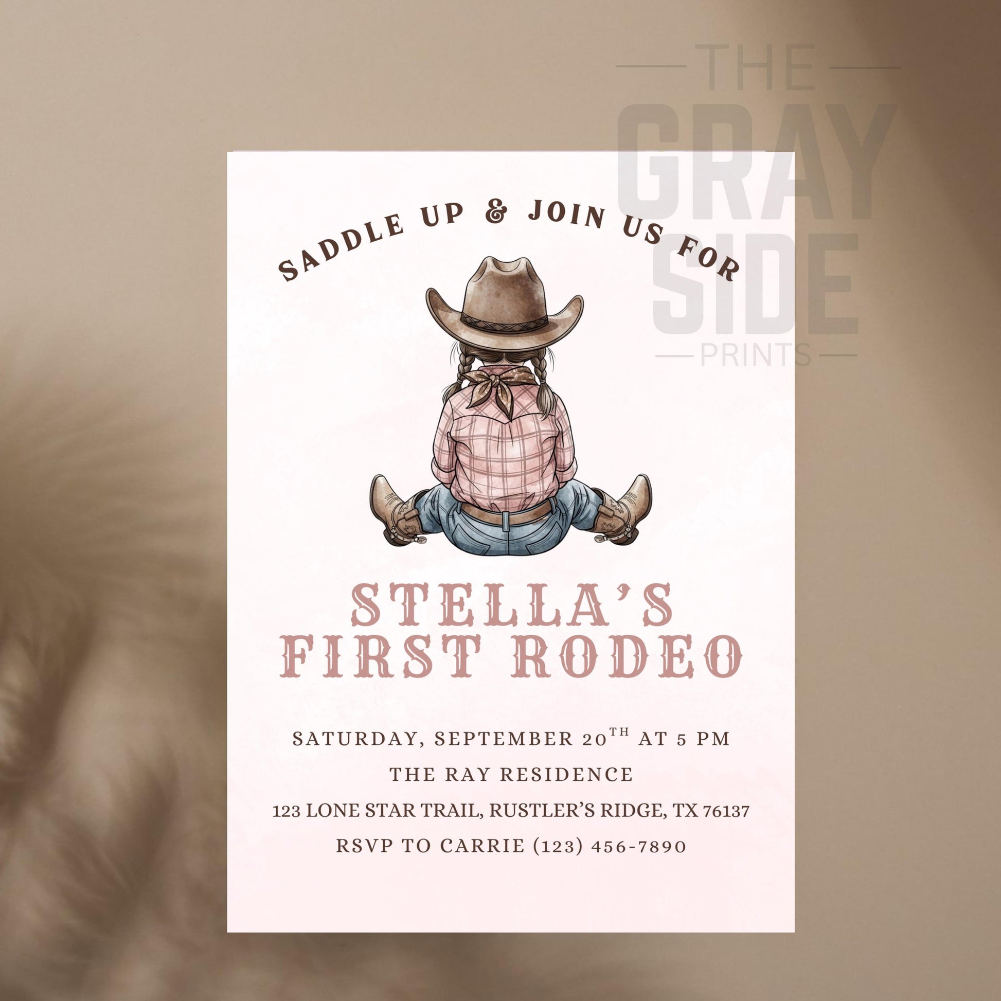 Saddle up for a rootin’ tootin’ celebration with this First Rodeo Birthday Invitation! 🤠 Featuring a sweet cowgirl in boots, hat, and braids, this rustic western invite is perfect for your little one’s first birthday party.