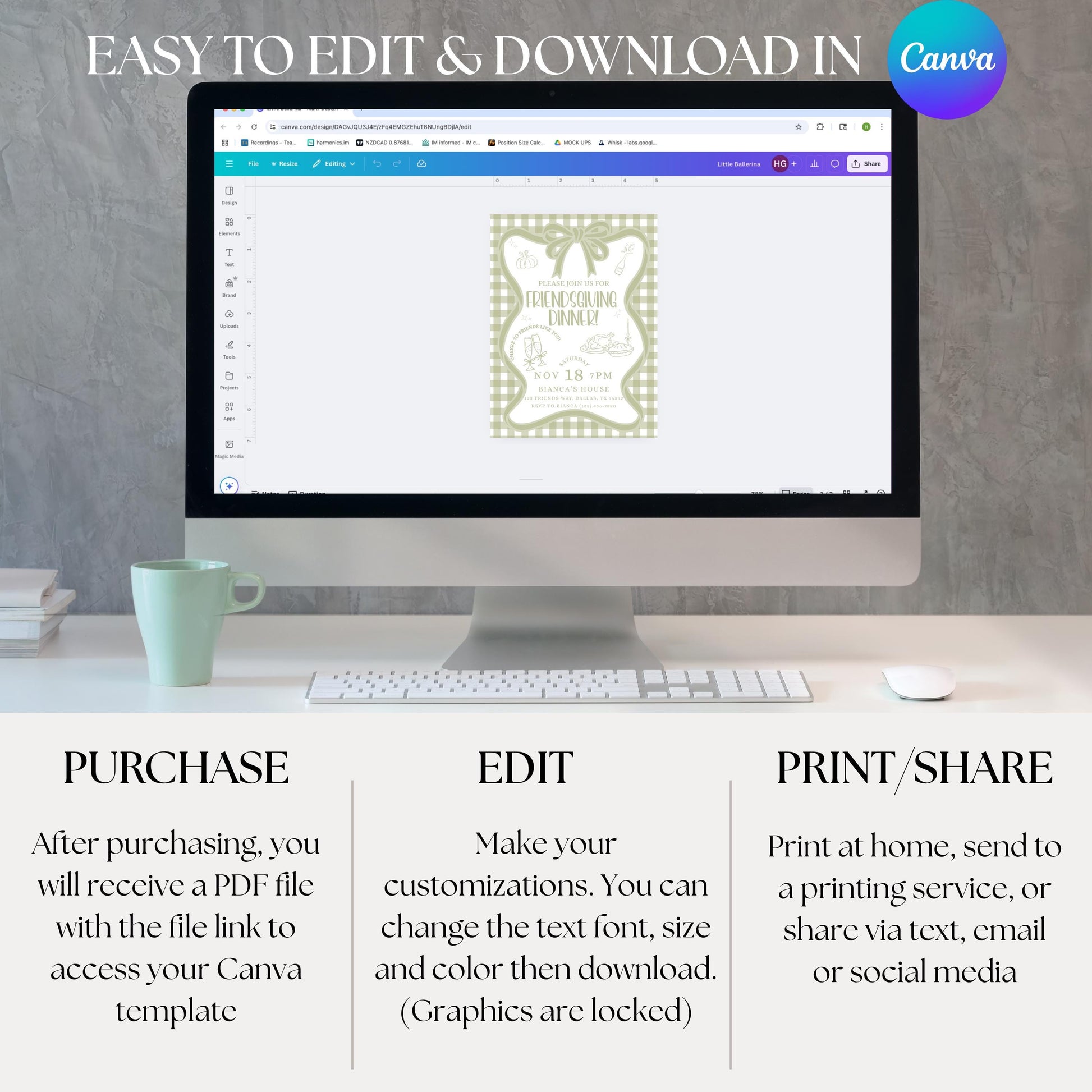 For the best experience, I recommend using a laptop or desktop to edit your template. While mobile and tablet editing is possible, Canva’s mobile features are more limited and may be harder to navigate.