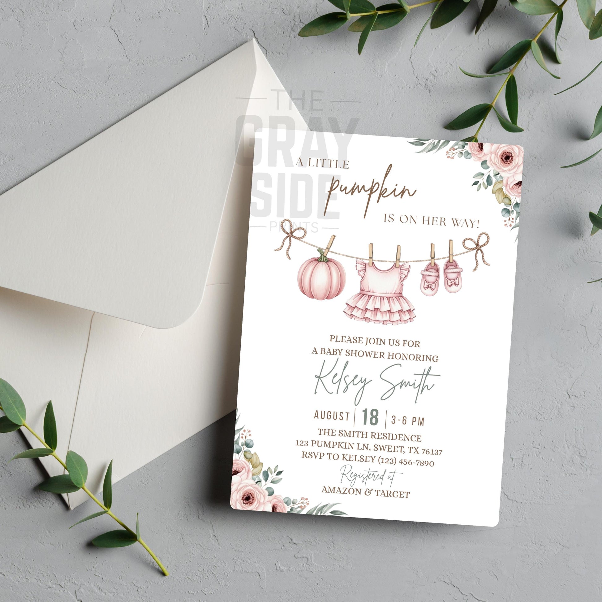 Celebrate your little one with this charming Little Pumpkin Baby Shower Invitation! Featuring soft fall florals, watercolor pumpkins, and adorable baby girl clothes on a clothesline, this elegant autumn design is perfect for celebrating a sweet baby on the way.