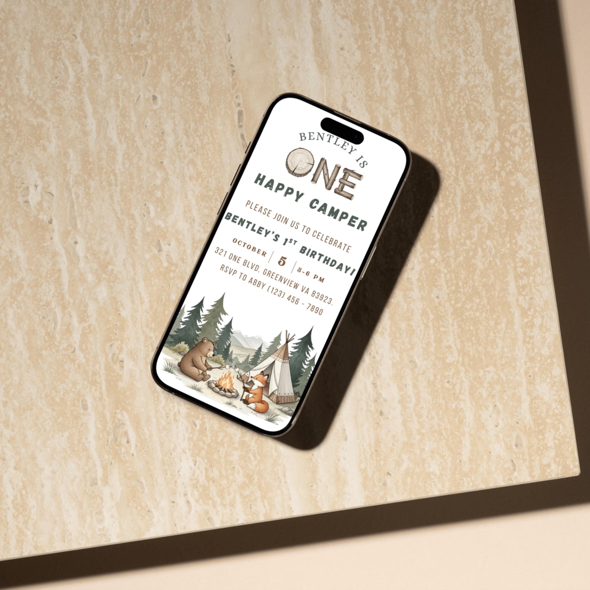 Celebrate your little one’s big day with this Happy Camper birthday invitation! Featuring adorable woodland animals, a cozy tent, campfire, and rustic forest design, this invite is perfect for an outdoor, adventure, or camping-themed party.