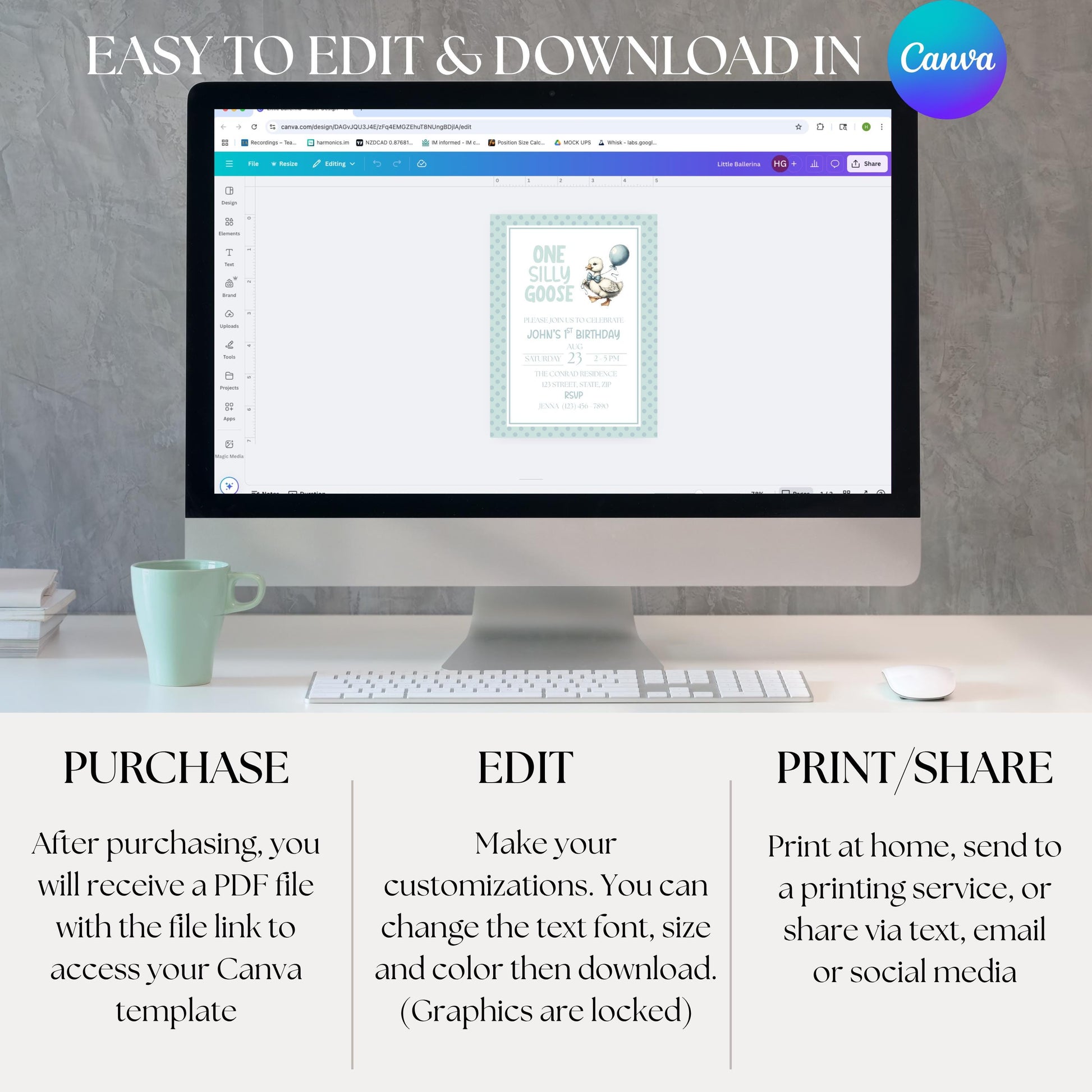 This editable Canva template allows you to personalize every detail — from name and date to time and location — and is instantly accessible after purchase. Whether you're throwing a sweet backyard bash or an indoor party, this goose-themed invite adds a whimsical touch that guests will love!