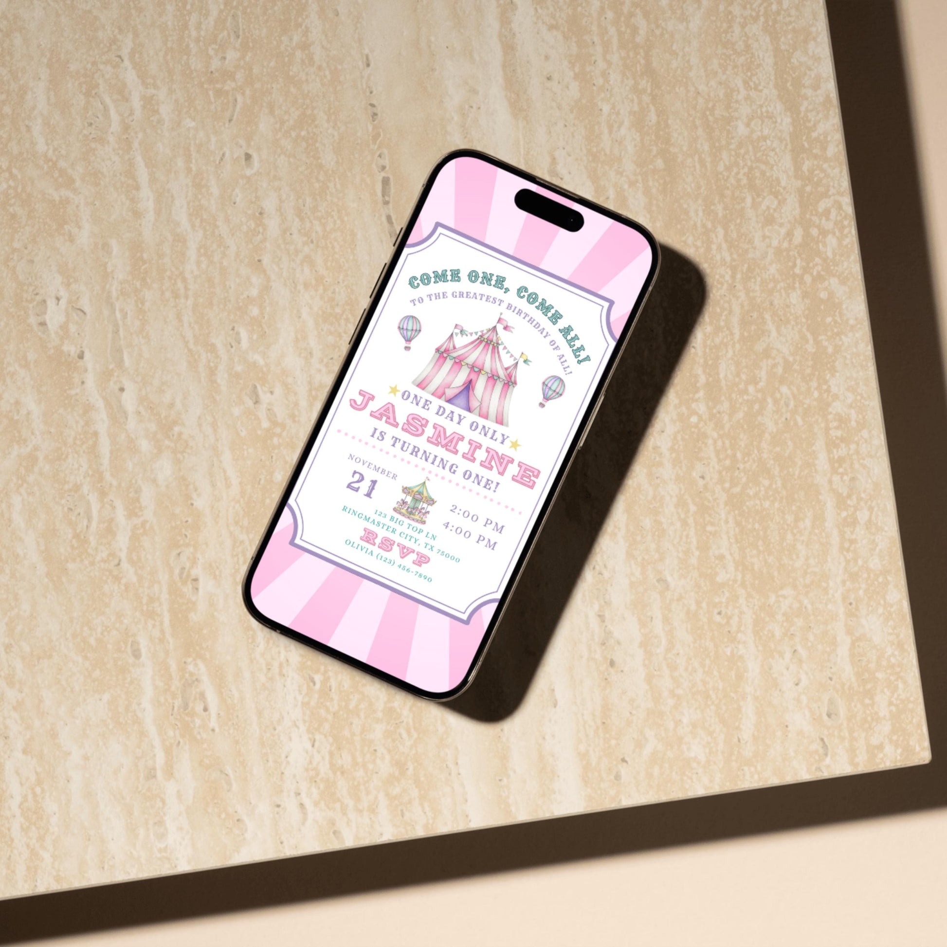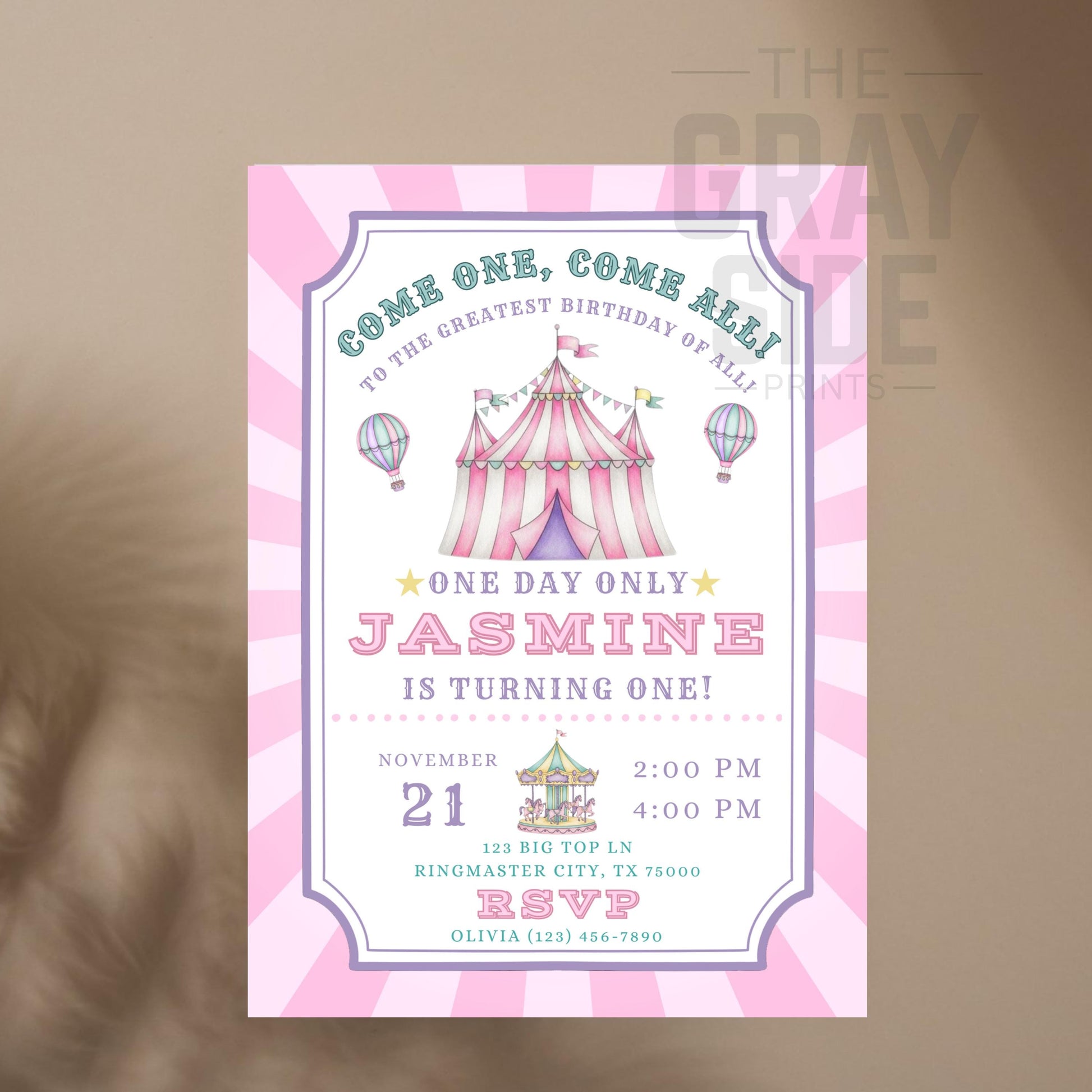 Step right up! 🎟️ Celebrate your little one’s big day with this adorable circus birthday invitation. Perfect for a whimsical carnival or big top themed party, this pink and pastel design features a circus tent, carousel, balloons, and playful fonts that set the stage for fun.