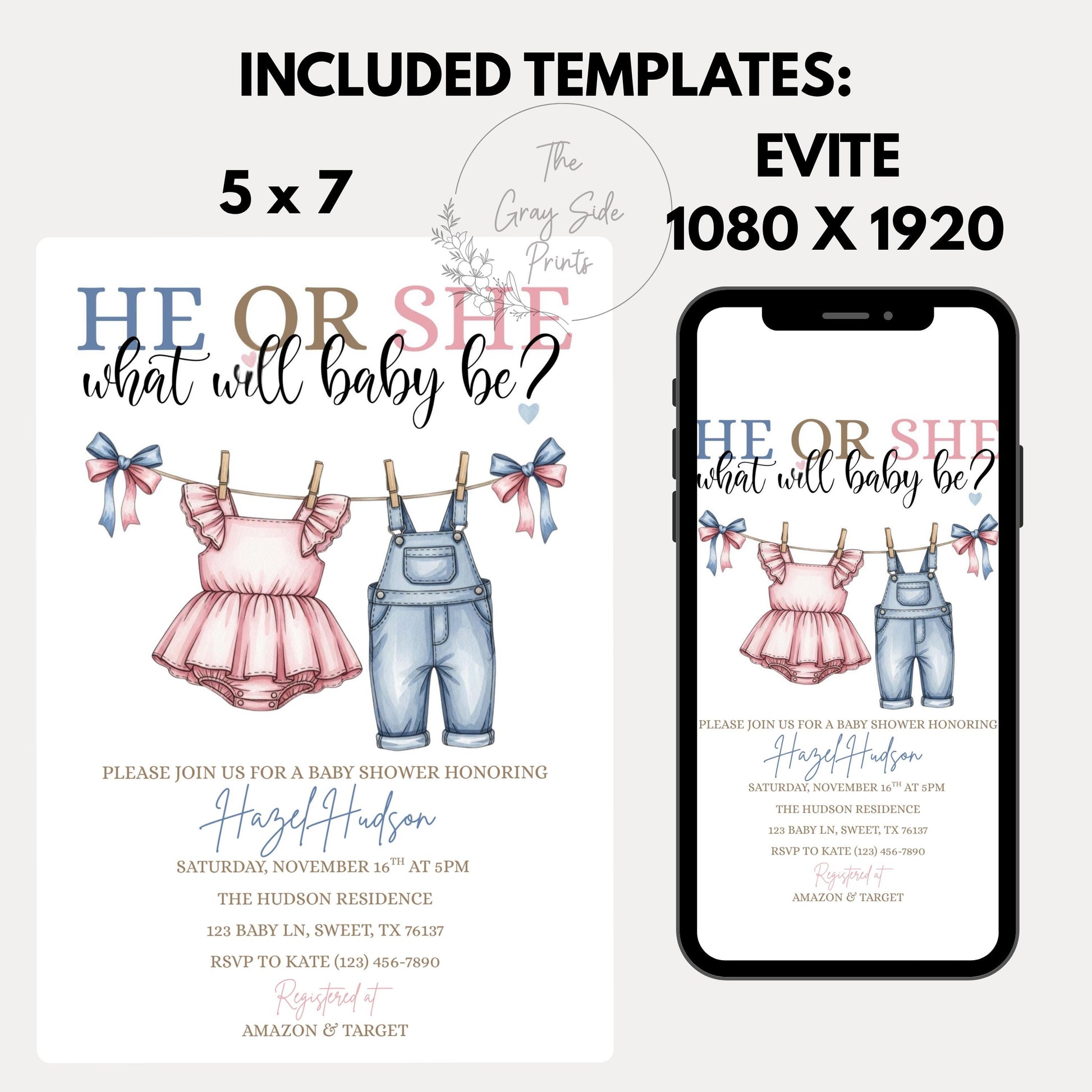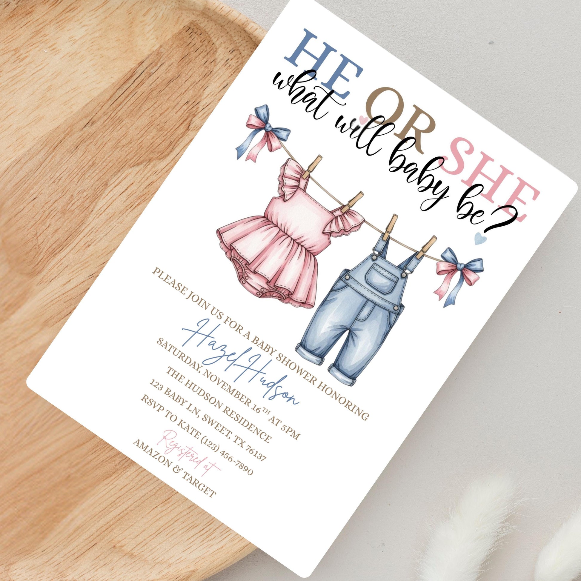 Pink or Blue Clothlesline Gender Reveal Invitation Baby Clothes Gender Reveal Invite He or She What Will Baby Be Surprise Gender Reveal