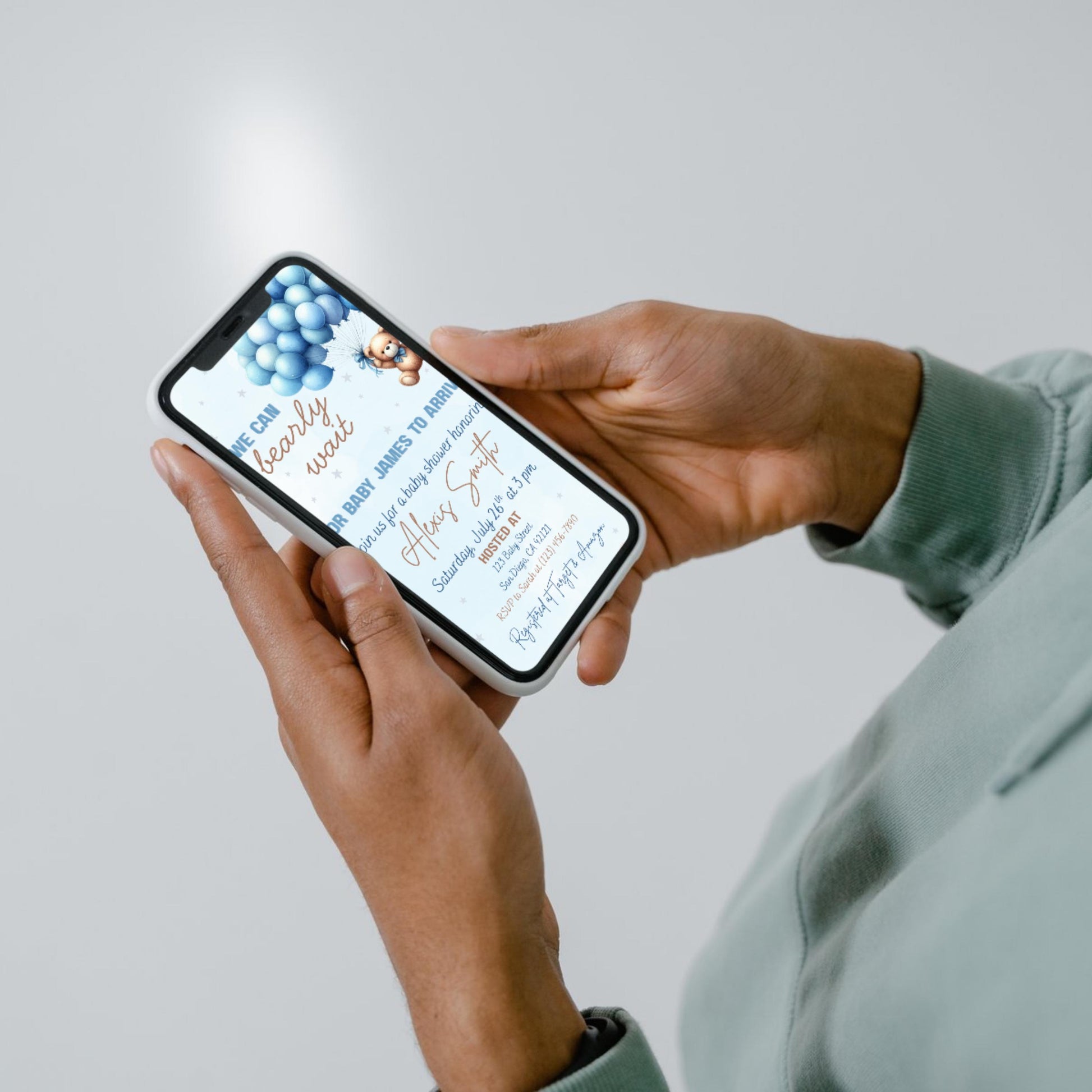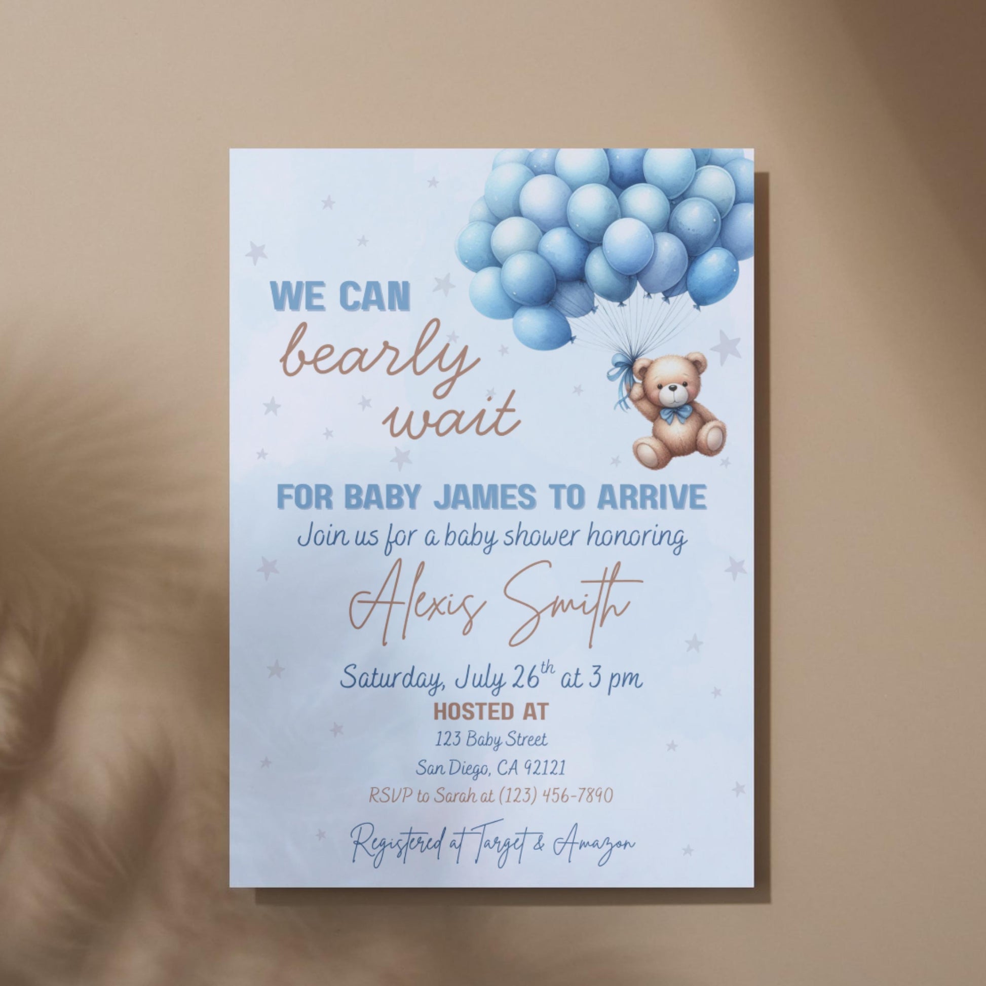 “We can bearly wait!” Celebrate the upcoming arrival of a sweet baby boy with this adorable blue teddy bear baby shower invitation. Featuring a lovable bear floating with blue balloons and dreamy star details, this charming design is perfect for a boy baby shower or teddy bear-themed party.