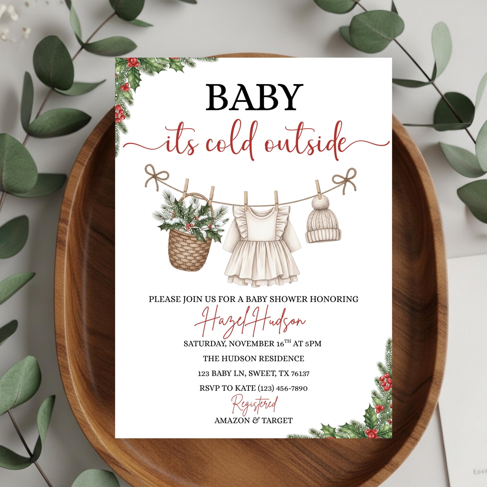 Winter Baby Shower Invitation Template, Baby it's Cold Outside Invite, Clothesline Baby Shower, Instant Download, Girl Christmas Baby Shower