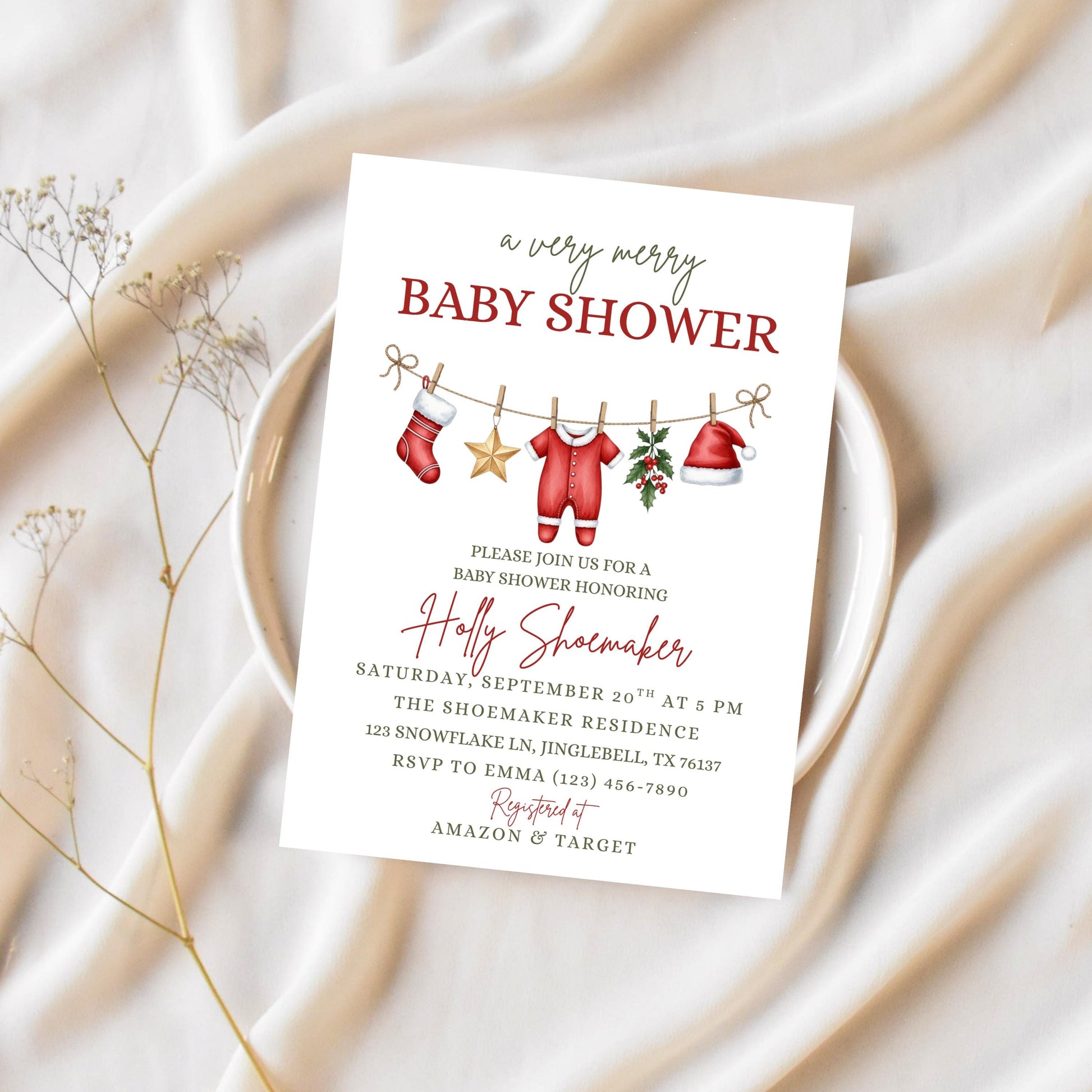 Celebrate the season and your little bundle of joy with this “Very Merry Baby Shower” Christmas invitation! Perfect for a holiday-themed baby shower, this festive design features winter greenery, holiday lights, and cozy Christmas vibes—ideal for boy, girl, or gender-neutral celebrations.